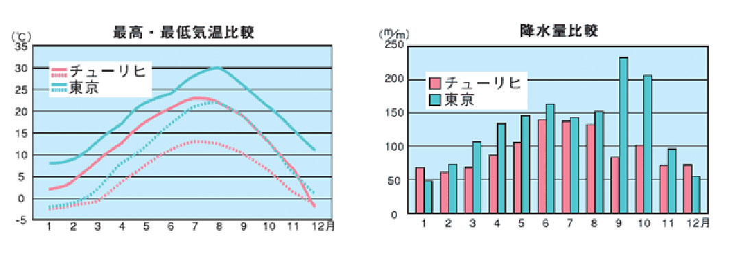 チューリヒと東京の最高・最低気温比較 チューリヒと東京の降水量比較
