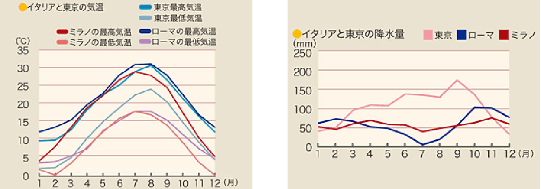 南北に細長く、温暖で四季がはっきりしている。日本の気候とよく似ており、ミラノ、ローマも東京の気候とさほど差がない。